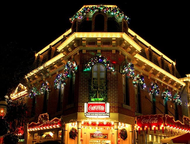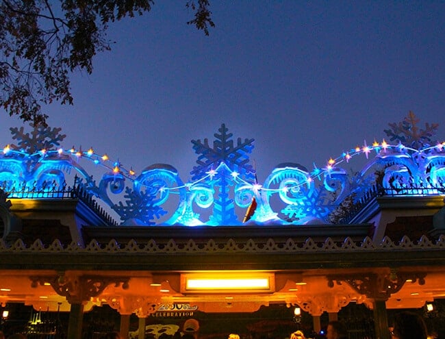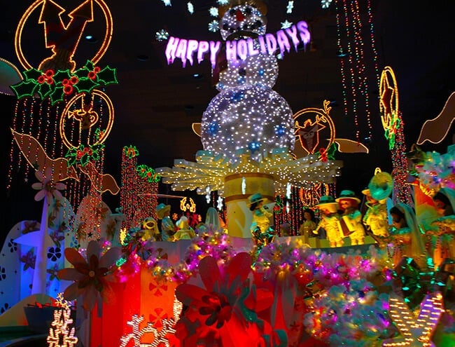 my all-time favorite ride to visit during the Holiday's at Disneyland is "it's a small world" at night. it is one attraction you will not want to miss. thousands upon thousands of lights have transformed it into a spectacular vision of colorful lights. as you ride the boats through the ride, songs of jingle bells and "it's a small world" fill the air. people young and old love to ride "it's a small world" during the holidays.