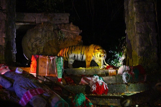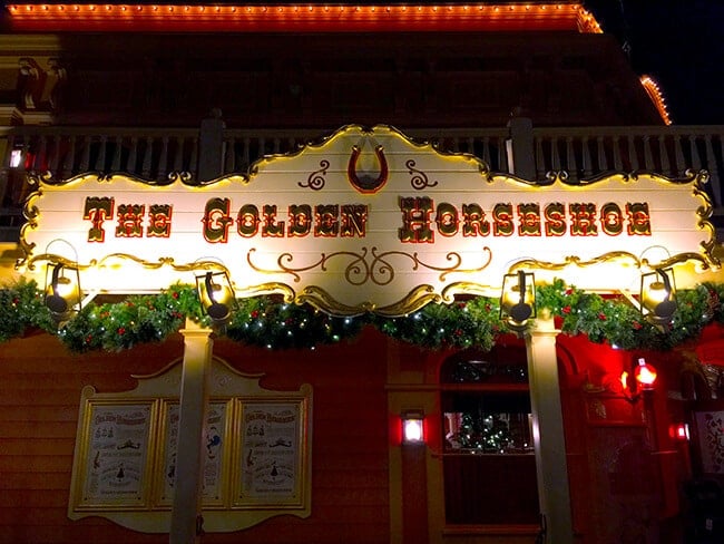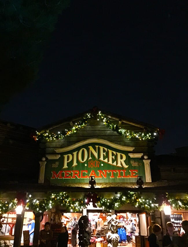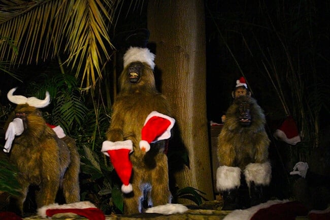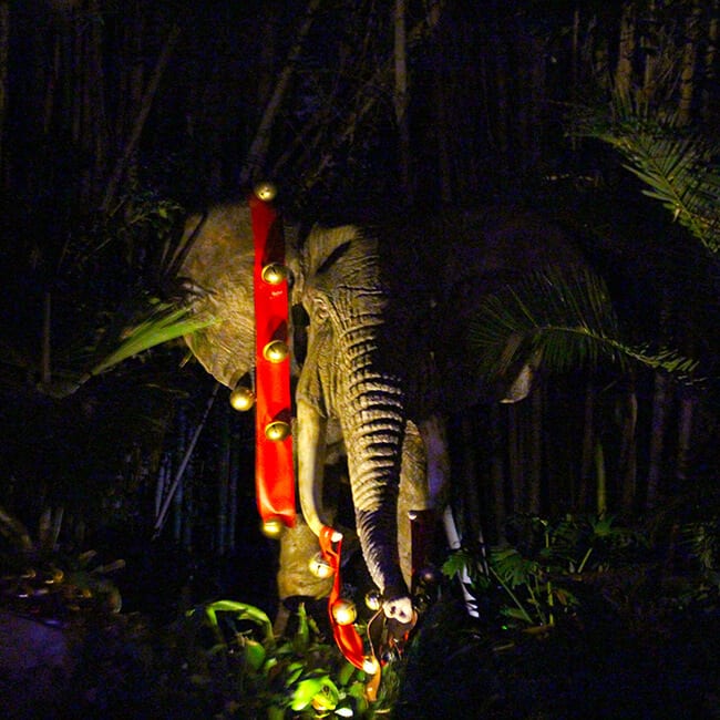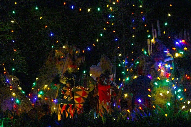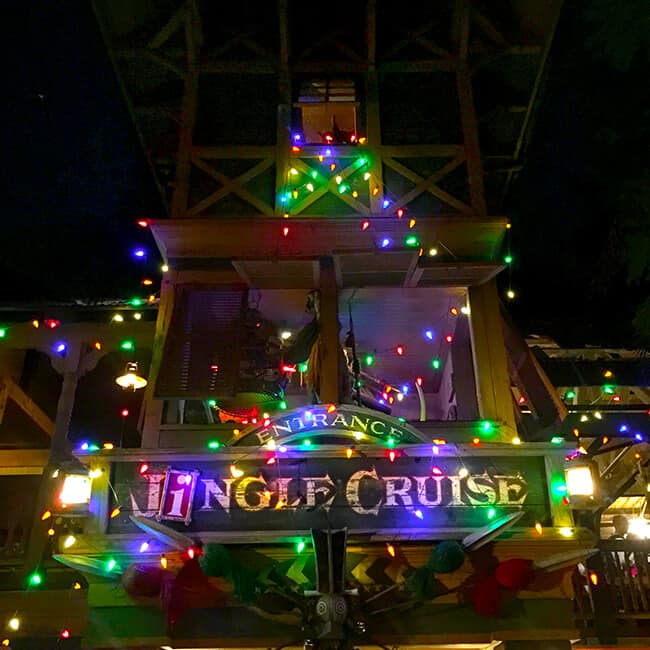 all the animals give you quite the Christmas jungle experience as you ride on the Jingle Cruise! after you make it off the boat, take a minute to enjoy Frontier Land decorated with lights.