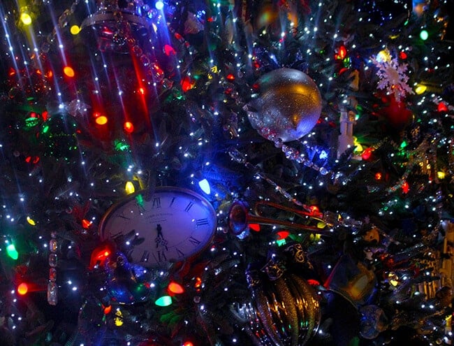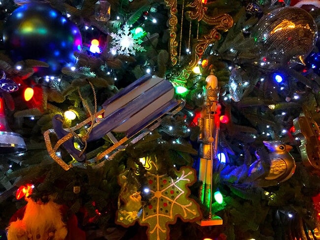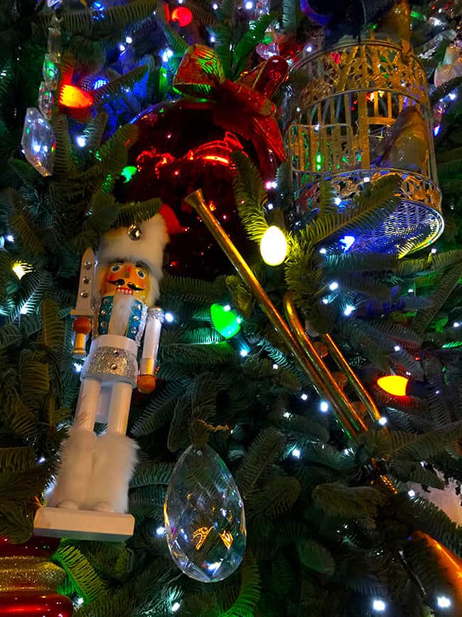 this year there have been some new additions to the tree. you will notice blue decorations celebrating Disneyland's 60th Anniversary. blue glass balls, blue sleighs, blue clocks and blue ribbons. crystals beads have also been added along with silver bird cages and sparkling glass snowflakes. it's the perfect way to celebrate the 60th Anniversary at Christmas time. a spectacular tree for sure.