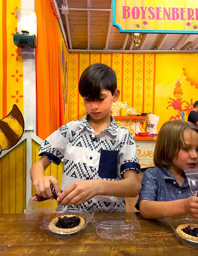 my middle son loved making his very own boysenberry pie in the Beary Tales Pie Kitchen. for just $5.99, you can make your own mini pie and decorate it with homemade whipped cream.