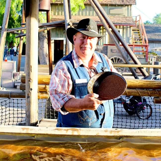 when you arrive at the Panning for Gold area, a Knott’s Gold Prospector will show you the ropes, tell you interesting facts about the gold rush era as well as teaching you how to pan for gold. It is simple as filling your mining pan with sand and swirling it gently beneath the water.