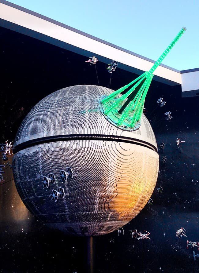 and waited anxiously as we learned that the new LEGO Star Wars™ Miniland Death Star would be over 8-feet wide, 13-feet high, weigh more than 1900 pounds and would feature a planet-destroying super laser. it is made out of more than 500,000 LEGO bricks and includes a display of the famous trench run scene where Luke Skywalker maneuvered his X-wing fighter through the combat zone to destroy the Death Star.