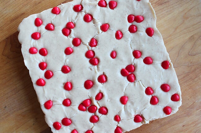 the end result was this 8 x 8" slab of fudge goodness. topped with cinnamon red hots, this fudge tastes like gingerbread Heaven. its rich, sweet, and spiced perfectly with the flavors of homemade gingerbread cookies. it looks a little cracked here because i was anxious to get it out of the pan...and took it out before it was fully set.