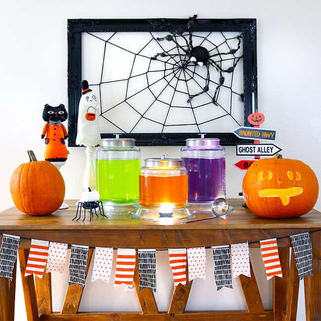First of all, how about setting up this fun Glowing Drink Station for you little ghouls and goblins. IT is one of my favorite easy tips for Halloween.
