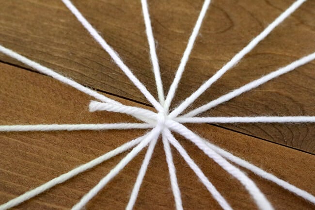 Next, starting from the center in a clockwise pattern, wrap the yarn around each strand. you will want to go over each strand first, then under and around again. then onto the next.