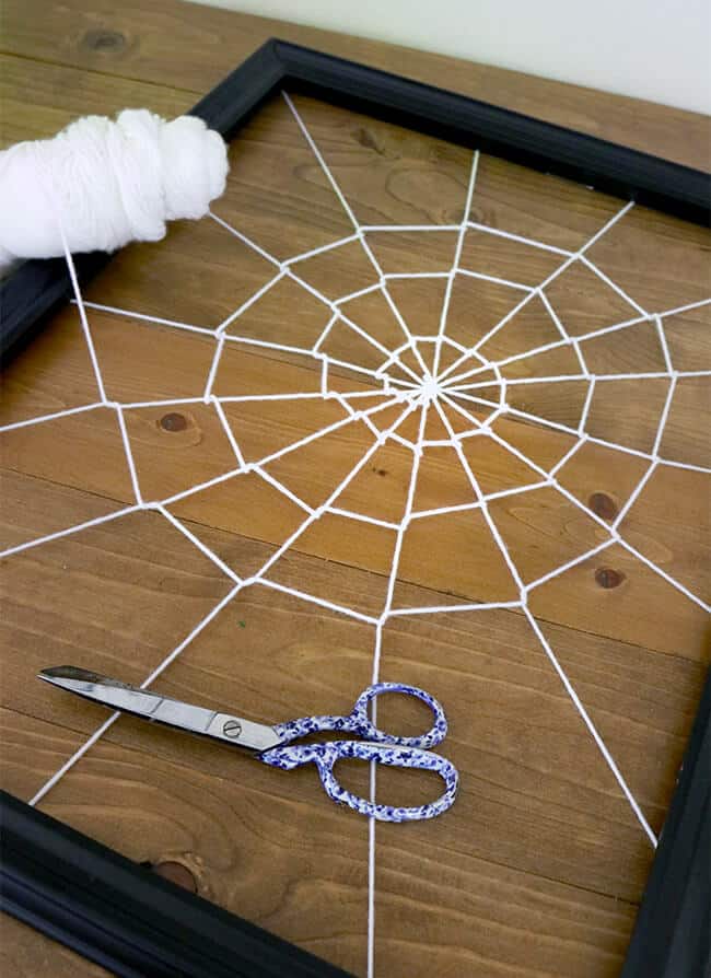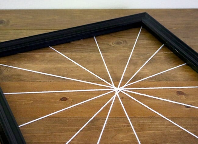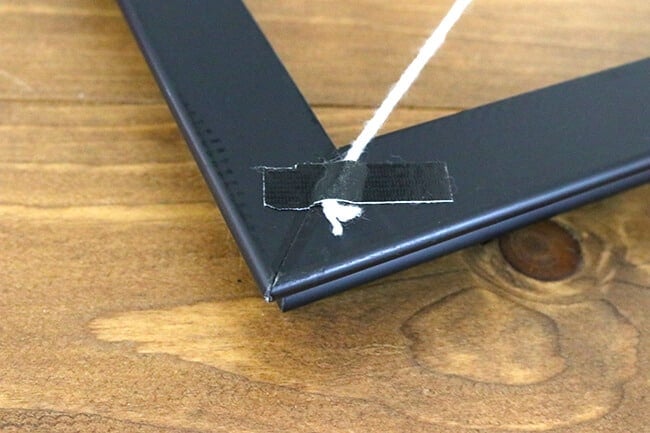 First, tape lengths of yarn to the backside of the frame in a wagon wheel pattern. 5-6 pieces will do.