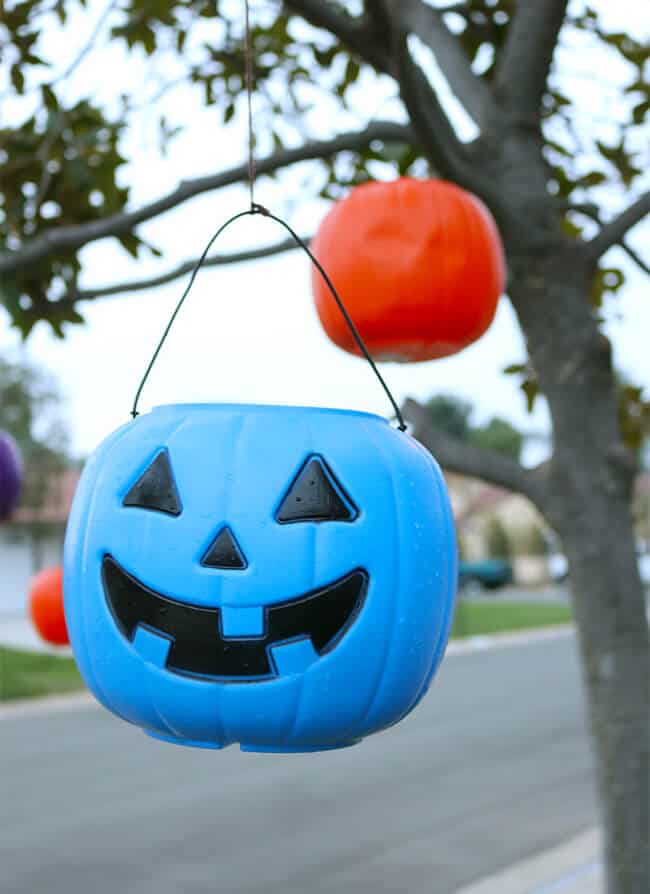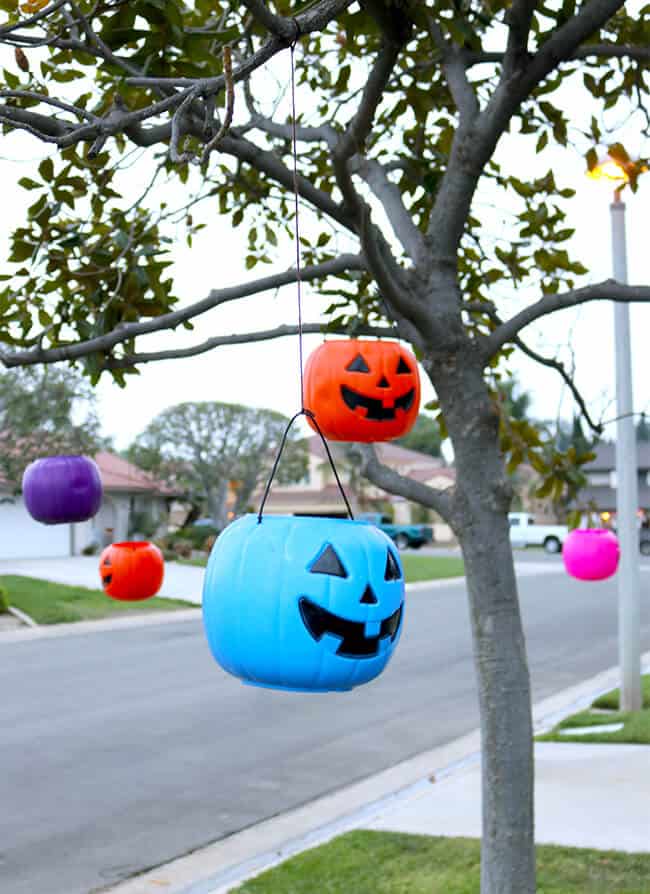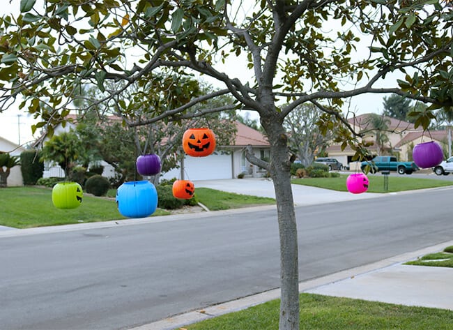 Finally, if you are looking for more fun and easy tips for Halloween, then check this out. Here is a great way to decorate your home and add some Halloween glow. Simply hang some plastic jack-o-lantern treat buckets in the trees.