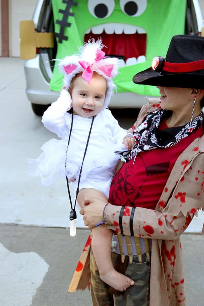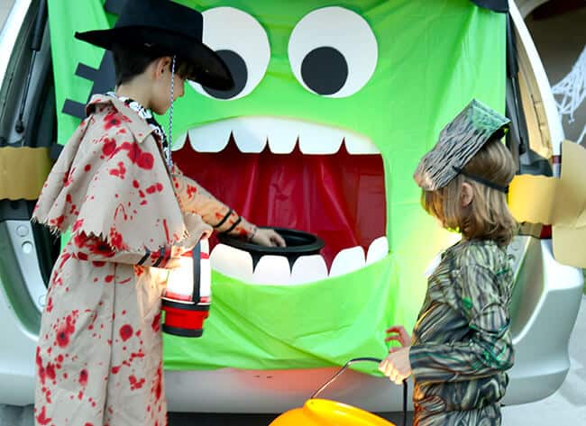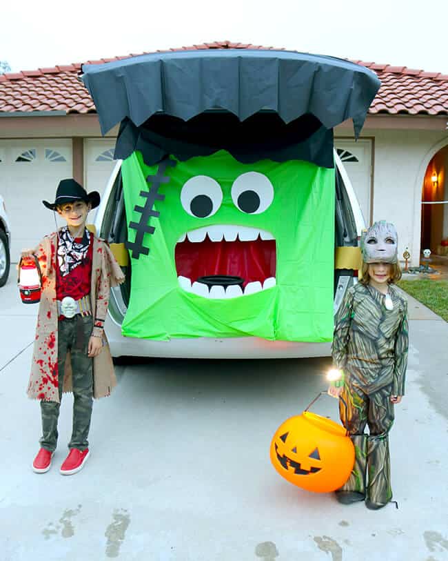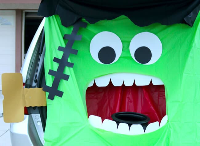 By using a red, green and black tablecloth, you can easily decorate your car as Frankenstein for Trunk or Treat. Simply line the inside with the read tablecloth. Then tape the green tablecloth over the opening. Cut the mouth of Frankenstein open to reveal the red.