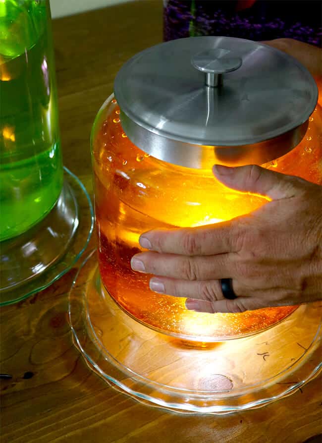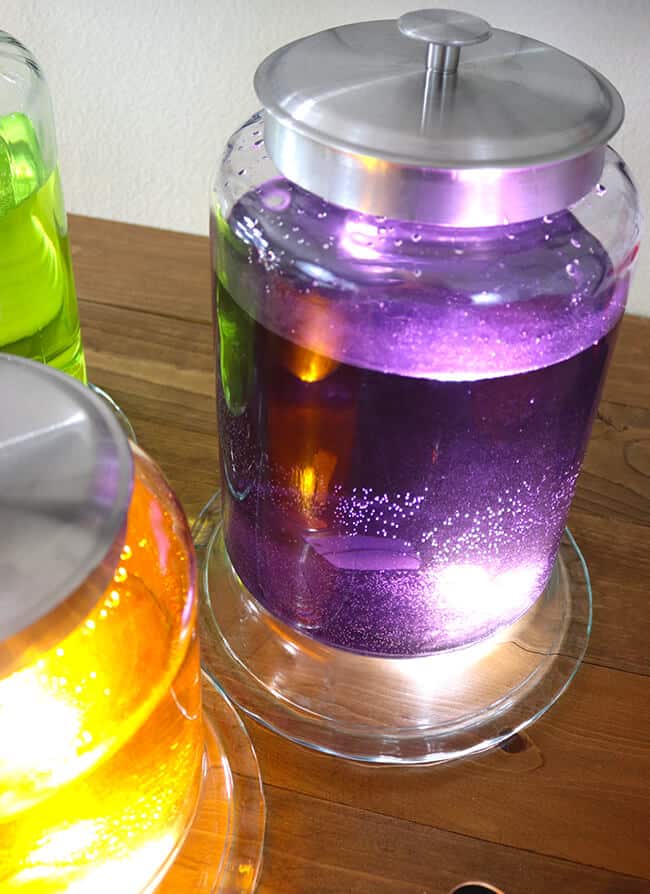 Now, place your drink container on top and pour in your colored drinks. You can color water, juice or soda with food coloring for the perfect color. Get ready for a fun spooky glow. You could even add dry ice for more fun! just imagine how great these look in a darkened room.