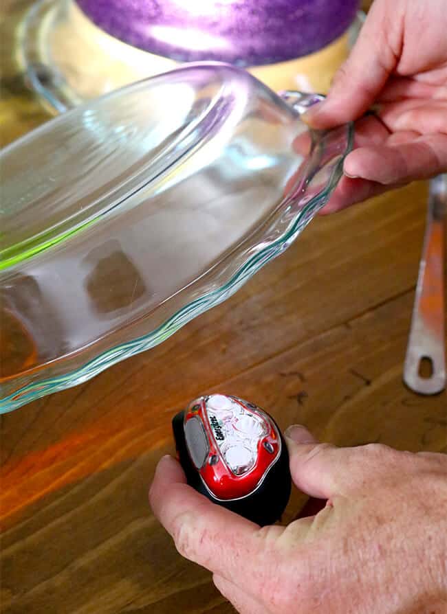 Place either an Energizer® LED Magnet Light or an Energizer® HD Vision headlight underneath each of the clear pie dishes or bowls. I actually prefer using the Energizer headlights because they are a little brighter, but both work great to light up the punch.
