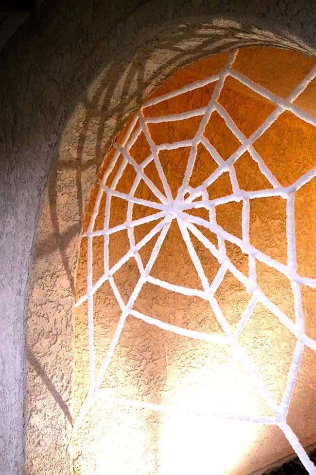 Remember that spider web frame?!! You can also use the same concept to make a giant spiderweb on your front entrance. Just use extra thick yarn which is available at the craft store and strong duct tape. You can let the neighbors know you’re in the spirit by adding a festive glow to your entrance Energizer® Weatheready® 360º LED Area Light. I LOVE how this turned out.