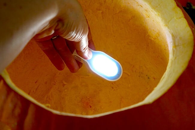 once your jack-o-lantern is all dry, it's time to light him up! like i mentioned before, you don't want to risk a fire by using a candle in your jack-o-lantern (especially here in Southern California). use the Energizer® LED Magnet Light in lieu of a candle to keep your jack-o-lantern radiant. it's simple, just turn on the light and set it inside!