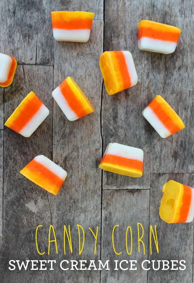 it's Halloween time! i love this time of year because i love all the cute Halloween decorations and fun ideas that you see all over the place. i don't like the scary stuff, but i love pumpkins, cute black cats and candy corn. i love, love, love the colors of candy corn. so i thought it would be fun to make some candy corn ice cubes. these Candy Corn Sweet Cream Ice Cubes are really simple to make and use ingredients you probably already have around the house. they are made with half & half, so they are great to put in hot chocolate, chocolate milk, coffee, root beer, cream soda or even sparkling waters.