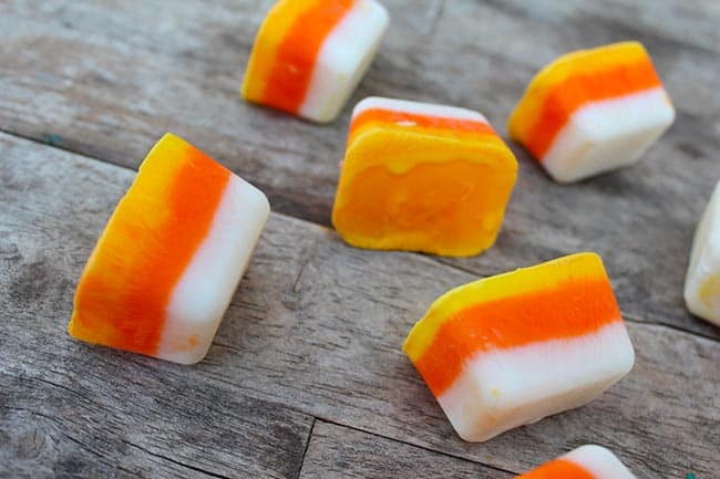 once all the layers are frozen, you will end up with these fun and festive Candy Corn Sweet Cream Ice Cubes.
