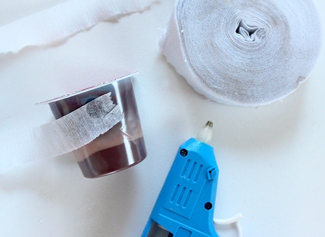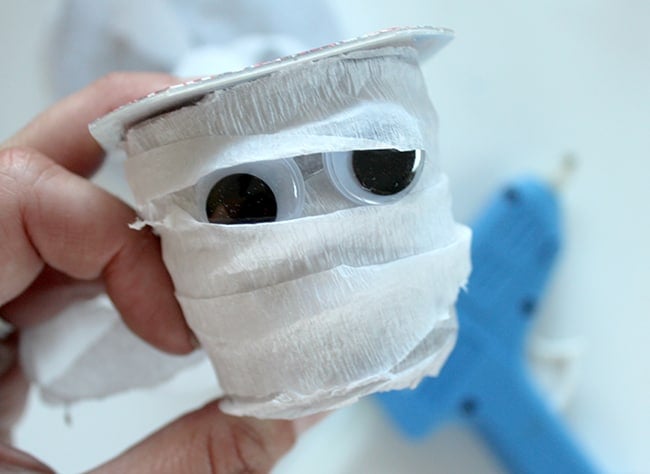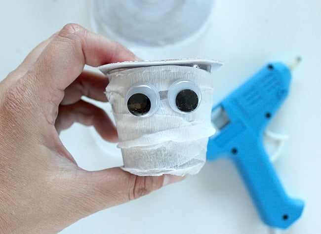 to start making your pudding cup mummy, glue the end of the crepe paper to the Snack Pack with hot glue or tape. i have found that you can do this entire project with just using hot glue and no tape.