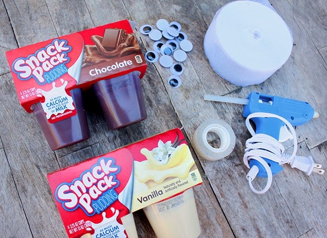 to make these Snack Pack Pudding Cup Mummies, you will need: Snack Pack Pudding Cups, white crepe paper streamers, googley eyes, hot glue gun with glue, or tape.
