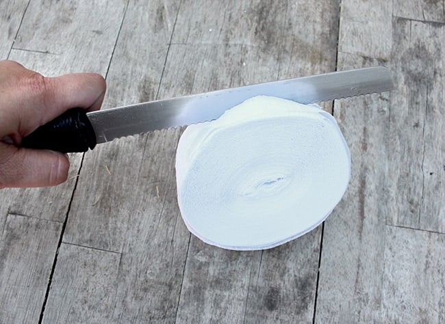 first, with a serrated knife, slice the crepe paper in half as shown. this will make the crepe paper the perfect size to start wrapping your Snack Pack like a mummy.