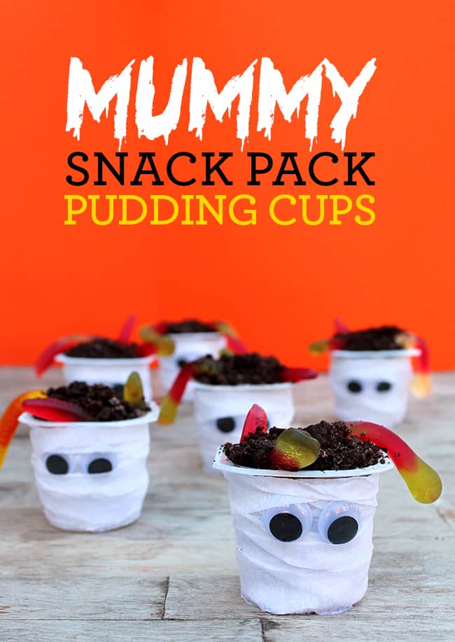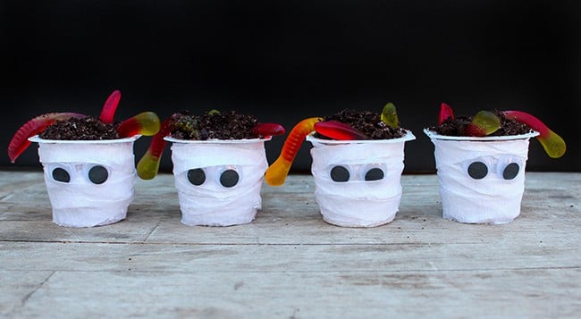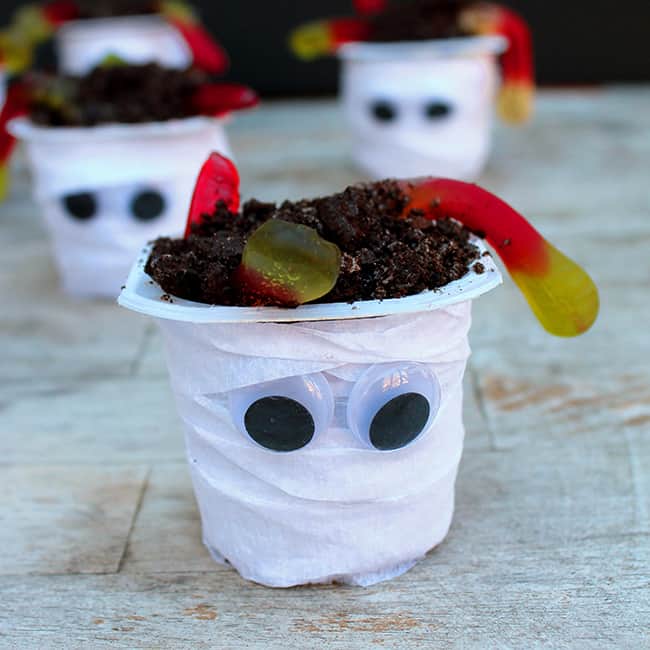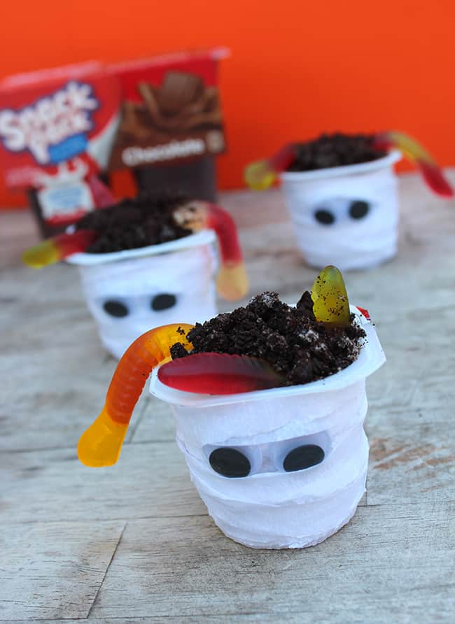 and if you want to add even more fun to your Snack Pack Pudding Cup Mummies, how about adding some mix ins. crushed Oreo cookies and some and some gummy worms will make your mummies a little more creepy.