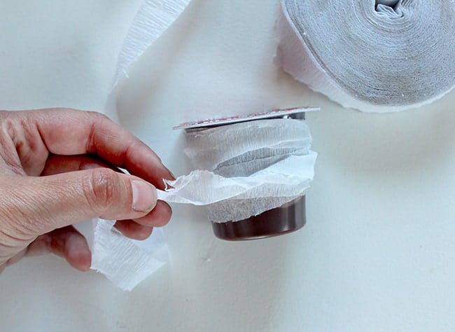 now you can start wrapping the crepe paper around the Snack Pack Pudding Cup. you don't need to keep the crepe paper smooth, in fact it looks more like a mummy if you let it twist and fold as you wrap it.
