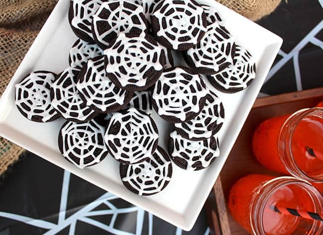 And for treats...because you have to have treats at a Halloween party, I made these Spider Web Halloween Oreos. By using a fine tip frosting piping tip, I simply piped on the spider webs with white royal icing onto my Halloween Oreos. I was surprised at how fast it was to make these, and they turned out just how I imagined.