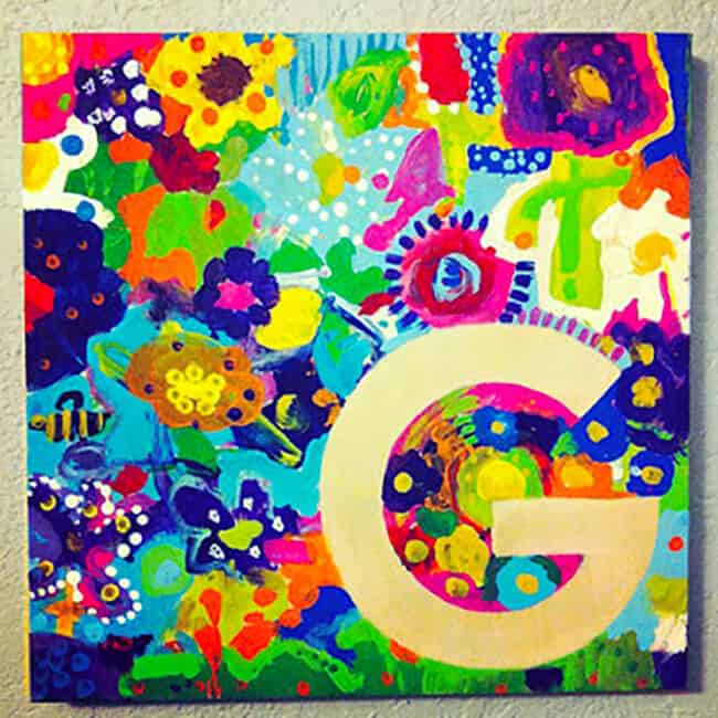then i cut the letter "G" out of a piece of sticker paper. (we call our grandma "G") i actually just used the label that was already on the canvas. but you could use avery label paper or even painter's tape. and it can be any letter you want. even a star or heart would be fab!