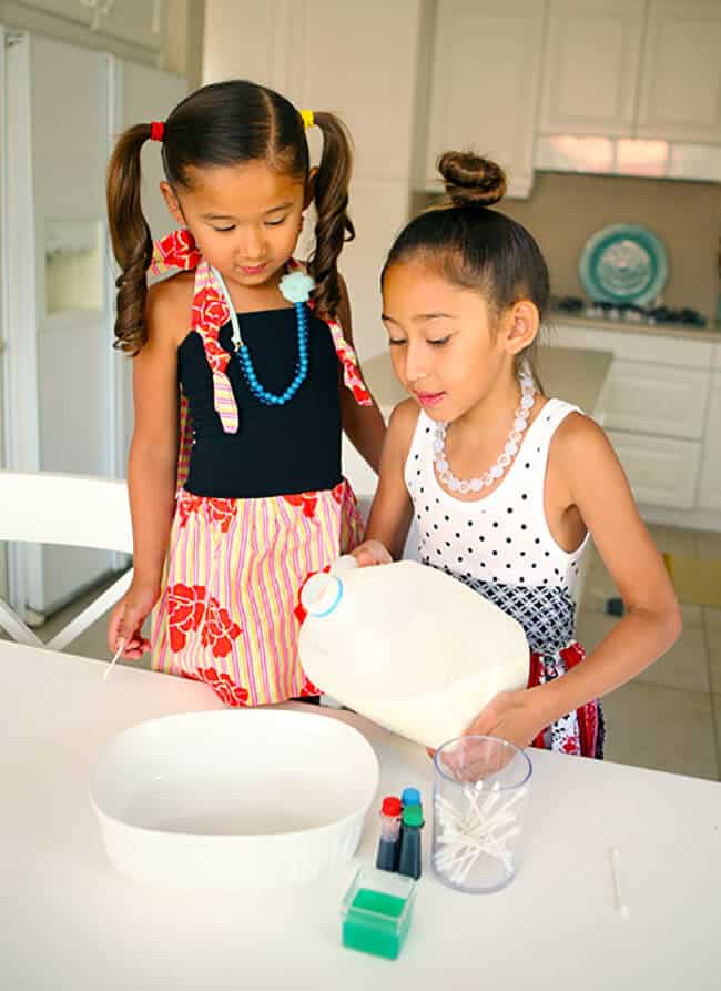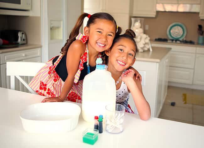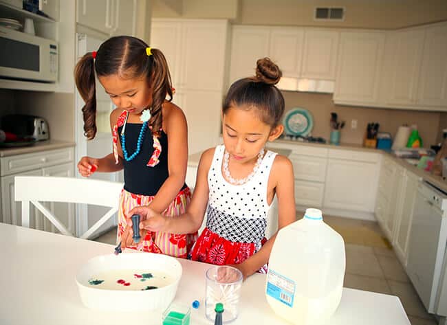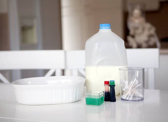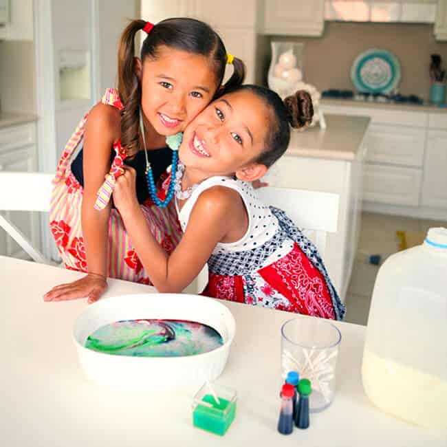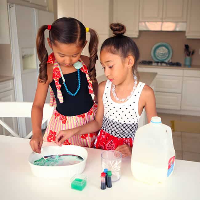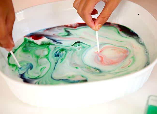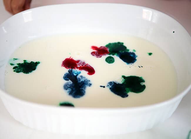 Explanation: While milk is mostly water, it also contains lots of fats, vitamins, and minerals. When you add dishwashing liquid to the milk, the soap’s hydrophilic (AKA water loving) and hydrophobic (AKA water fearing) ends react with the fat in the milk. The dishwashing liquid is the inspiration for the colorful fireworks that result from the milk and food coloring combo.
