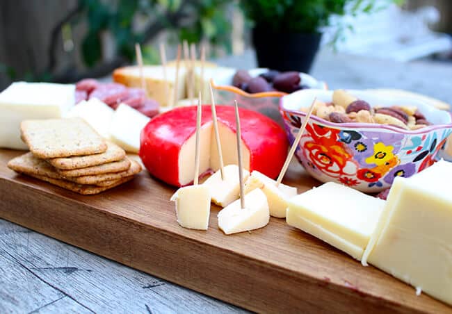 now to create the cheese platter, all i did was place the different cheeses on a nice cutting board. if you don't have one, check out the ALDI Finds aisle in ALDI...you may find one. i got a nice circular slate platter at ALDI that would make a great cheese plate. but for this summery cheese board, i thought a wood one would be best.