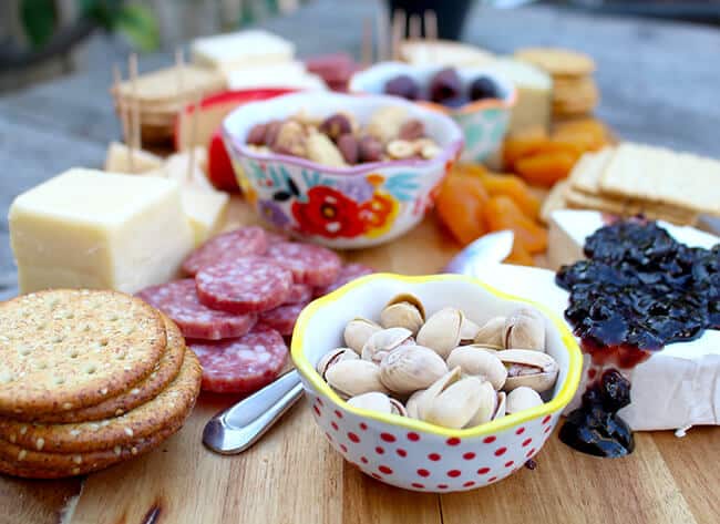 here is what my cheese platter ended up looking like. i can't wait to make one for my next party. and these cheeses and other items aren't just for entertaining. my boys have loved them in their lunches. i just cut the cheese into bite-sized pieces, include some crackers and salami, and they have a great snack for school. ALDI is a great place to shop when you are looking for unique items for entertaining. i will definitely be visiting often this summer to stock up on all the great food products...i love hosting summer dinners with friends, and it's always nice to have something for them to snack on while they are waiting for the food to finish on the barbecue. plus, i can also purchase everything i need for dinner at ALDI. best of all, i will be saving money, prices at ALDI are amazing! especially considering the high quality of their products. i am so happy that ALDI has made their way to California.