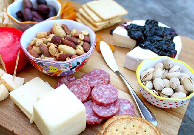 after i laid the cheese out on the board, i filled in the open spaces with nuts, dried fruits, olives, salami and crackers. fresh fruit would also be great on the platter. ALDI has great fresh produce, so be sure to check it out. you can put the nuts directly on the board, or in little dishes like i did. i also cut some of the cheese into bite sized pieces and added some toothpicks. ALDI had some yummy Specially Selected Blackberry Fruit Spread on sale, i knew it was yummy because i tried it at the event. i decided to drizzle it over the creamy brie. the preserves and the brie complement each other, and can be served with crackers or apple slices. i really love how my board turned out. so much goodness on one plate!