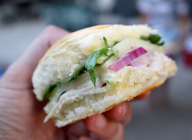 these little sliders taste really good. the Foster Farms All Natural Sliced Turkey – Honey Roasted & Smoked flavor pairs perfectly with the sweet roll, nuttiness of the arugula, great red onion flavor and pesto mayonnaise. they make the perfect summer dinner for my family and even my picky eaters like them.