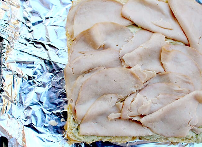 now, layer the turkey over the pesto mayonnaise. you will most likely use the entire package.