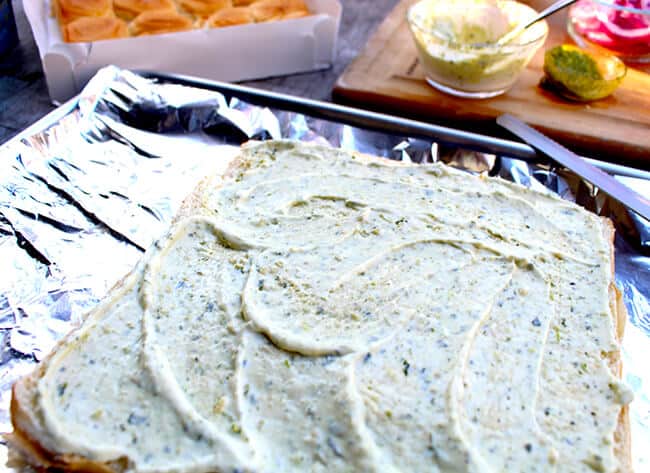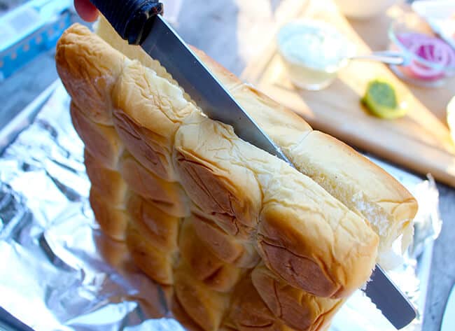 first, cut the rolls in half with a serrated knife. leave them all together in one piece, don't separate into individual rolls.