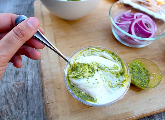 next, make pesto mayonnaise by combining ½ cup mayonnaise with 2 Tablespoons of pesto.