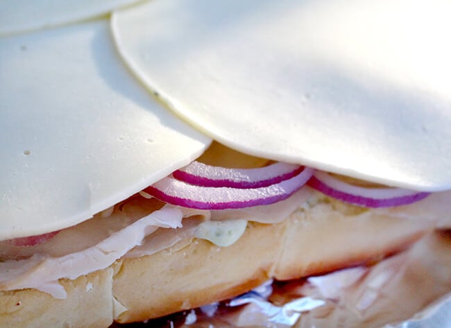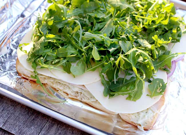 here’s what you need to make these Arugula Provolone Turkey Sandwich Sliders: Foster Farms All Natural Sliced Turkey Honey Roasted & Smoked flavor, dinner rolls (the kind that are still together work best, i prefer the Hawaiian style ones), Provolone cheese, arugula, red onion, pesto and mayonnaise.