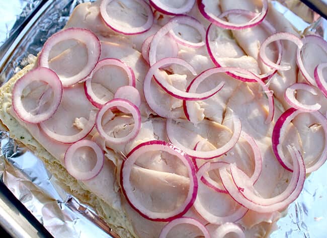 place thinly sliced red onions over the turkey.