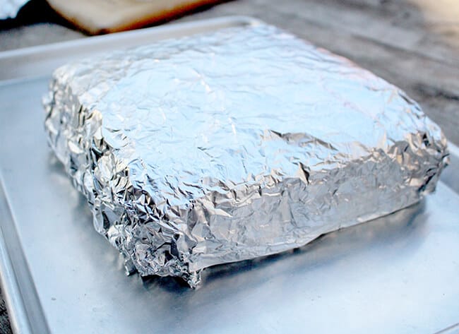 wrap up tightly with foil. first by pulling the bottom foil up and then placing another piece of foil over the top. place into a 350º oven for 20-30 minutes until cheese is melted.