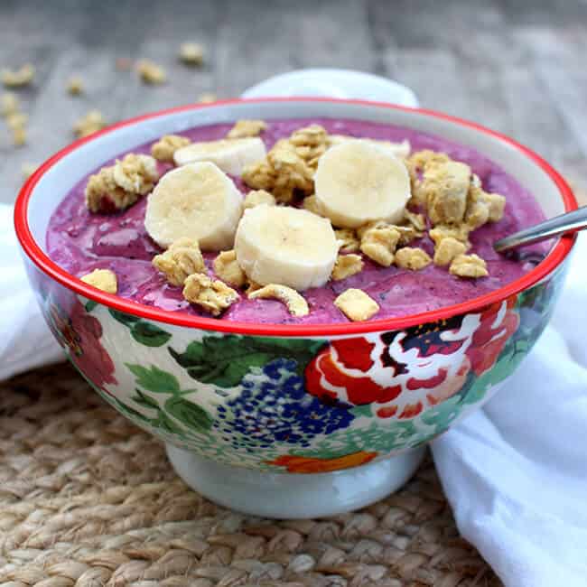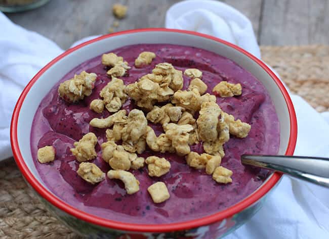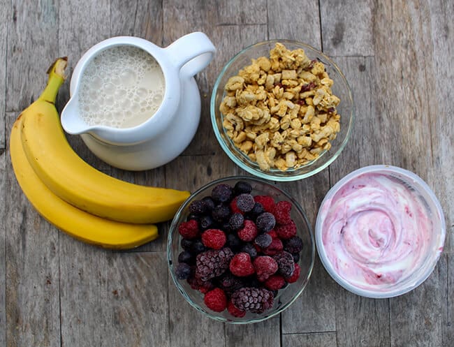 to make a Berry Breakfast Bowl you need ½ cup Silk Almond Milk in vanilla or plain, 2 cups of frozen berries, 1 container of Noosa Yoghurt, Kashi Cereal, and a banana. this is enough for two-three bowls, depending on how hungry you are.