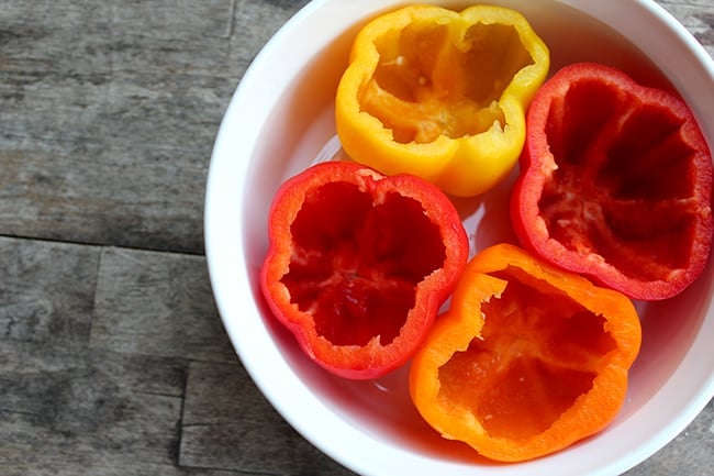 cover bell peppers with foil and place into a preheated 350º oven for 30 minutes. remove foil for last 10 minutes. let cool for 5 minutes before eating. enjoy!
