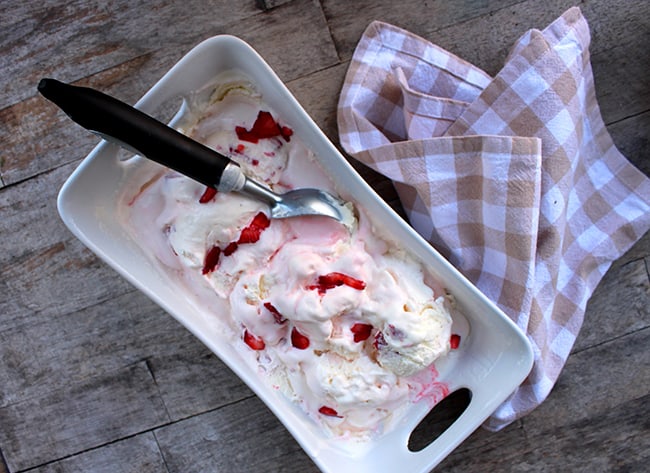 Strawberry Ice Cream: add 3 cups chopped fresh strawberries and a couple drops of red food coloring (optional). add to vanilla mixture before placing into the ice cream maker.