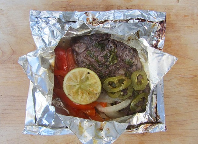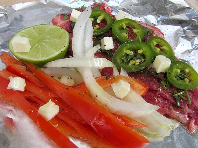 preheat your grill or heat your coals on your campfire to medium high. on a piece of heavy duty tin foil (approx. 12" x 12"), lightly coat with olive oil and dot with butter. season both sides of your steak with salt and pepper. place the steak in the center of the foil. spread minced garlic on the steak and then place sliced jalapeños on top. next, place fresh vegetables and squeeze lime juice over everything. place the rest of the lime next to the steak. dot with butter and cover with the second piece of foil over the top. seal each side of the foil shut. once your packets are sealed and marked, place them onto the grill at medium-high heat. grill them for 8-10 minutes (depending on how you prefer your meat), flipping them over halfway through cooking. when they are finished grilling, let stand for 2-3 minutes before you open foil in the middle and enjoy.
