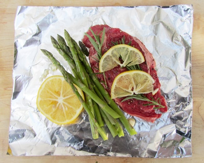 Father's Day is going to be really fun for our family this year. the boys and i are going camping. we're very excited to be spending Father's Day with daddy. camping is my kids favorite thing to do. and i love to cook when we're out camping, especially grilling. so this week i have been trying out some camping-friendly recipes that can be made ahead of time to take along with us on our trip. one of my favorites that i would like to share is a Lemon Herb Steak with Asparagus created in a foil packet. made with all fresh ingredients and makes a great summer grilling recipe. the fresh lemon especially adds a wonderful summery flavor.
