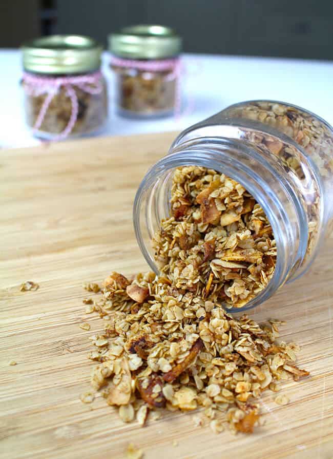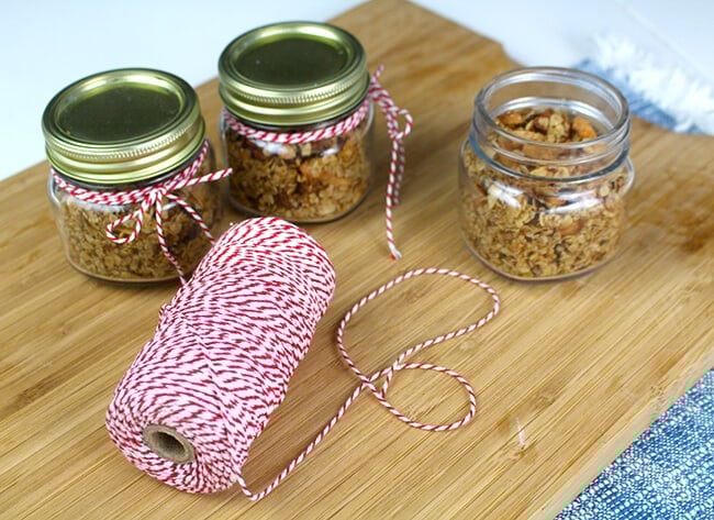 i ended up making so much granola, that my boys wanted to take some to their school teachers. so i found some cute jars and filled them up and tied them with string. now the boys can take a nice better-for-you treat their teachers to munch on during recess.