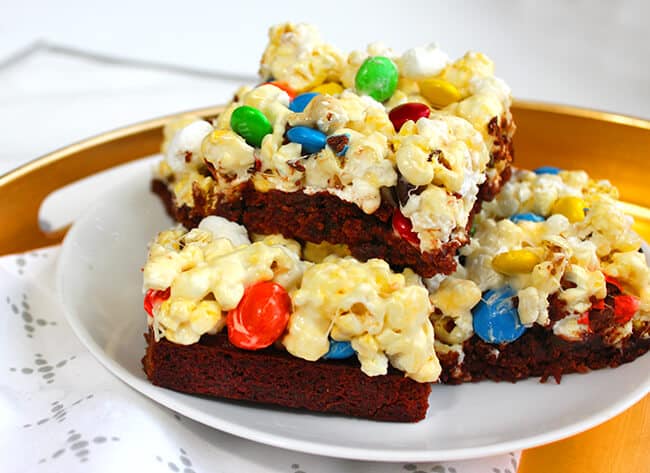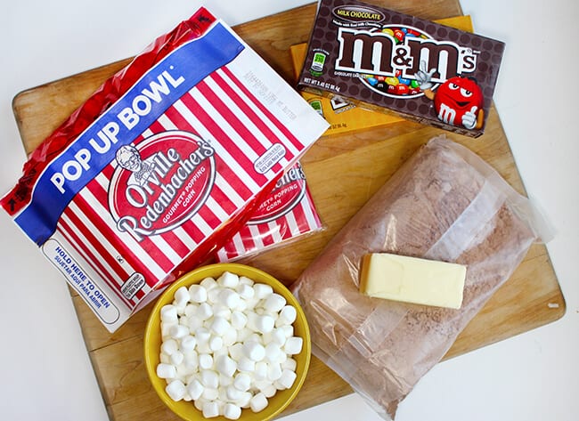 and now for the recipe, Brown Butter Popcorn Brownies are really easy to make. you will need 7 cups of Orville Redenbacher's Buttered Popcorn, 1 cup of M&M's®, 5 cups of mini marshmallows, 5 Tablespoons butter and a pan of prepared brownies.
