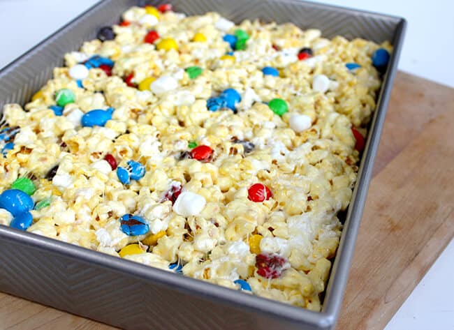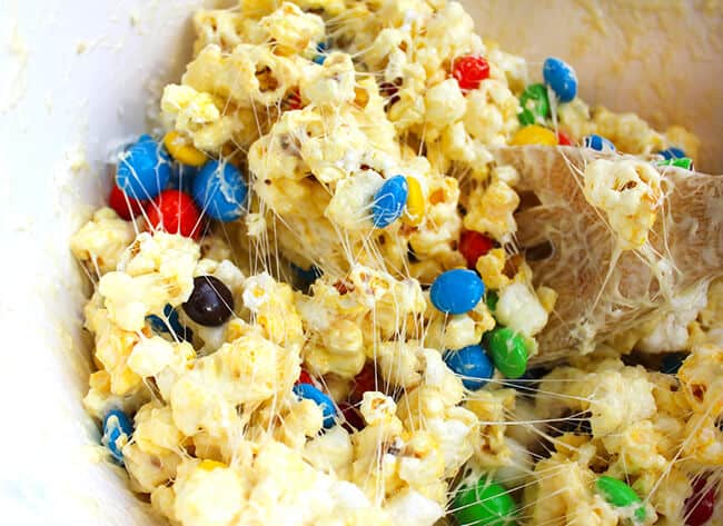 next, add 1 - 2 cups of marshmallows, and 1 cup of M&M's®. i used both peanut and plain M&M's®. stir until completely combined. pour the marshmallow popcorn mixture over the cooled brownies.