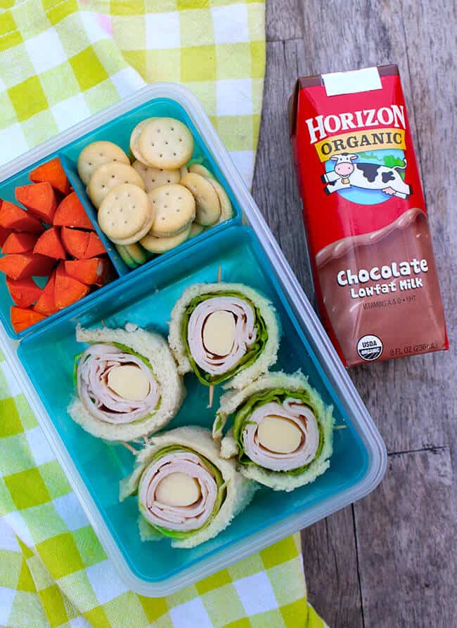 for my first lunch, i made some sandwich rolls using Horizon Cheese Sticks. all i did was wrap some lunchmeat and lettuce around the cheese stick and then bread with the crusts off around that. i secured them with toothpicks and places them in the box. i think the boys will think they are pretty cool. i also included some carrot sticks, Horizon peanut butter sandwich crackers, and some Horizon chocolate milk.