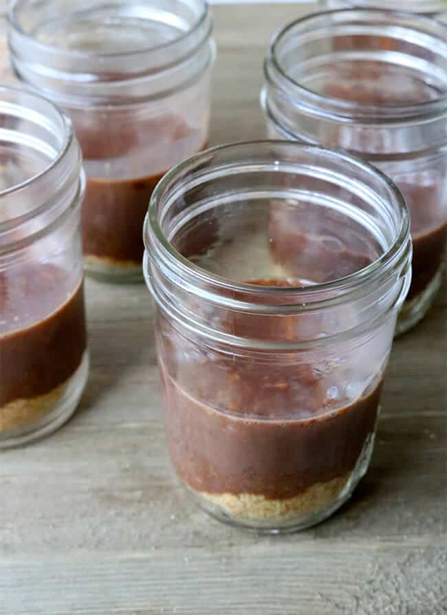 Now, pour chocolate into jars over the graham cracker crumbs.
