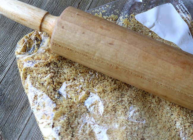 First, in a plastic zipper bag, crush up graham crackers and mix in melted butter.