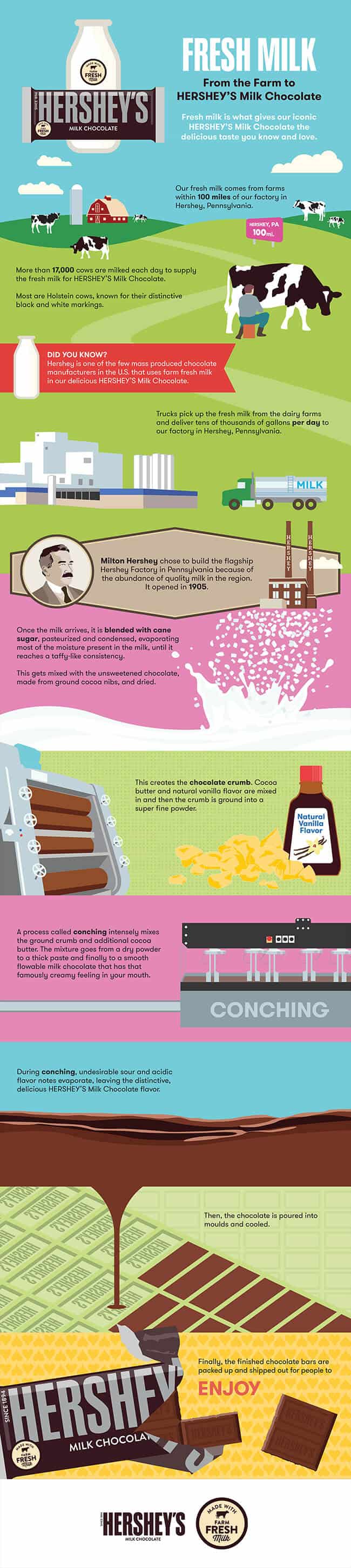 Check out the graphic below to see how farm fresh milk becomes part of HERSHEY’S Milk Chocolate.