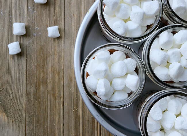 Now, top the chocolate and graham cracker crumbs with mini marshmallows to the top of the jars. Then put all the jars in a baking dish.