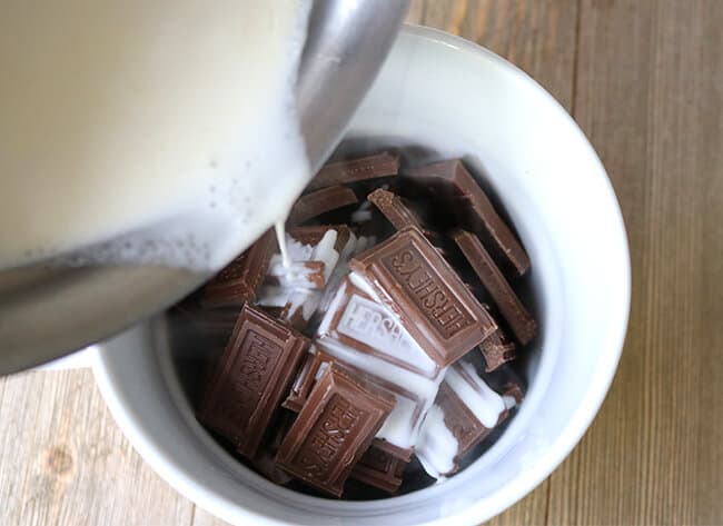 Heat the whipping cream in a saucepan on the stove until hot. Then pour it over the HERSHEY’S Milk Chocolate.